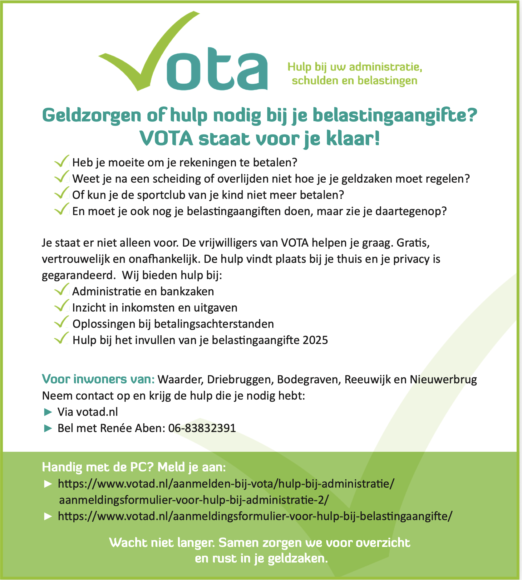 VOTA is een vrijwilligersorganisatie en geheel onafhankelijk van de gemeente of enige andere organisatie. Wij bieden u deze ondersteuning gratis en veelal bij u thuis. Uw privacy is voor ons heel belangrijk.